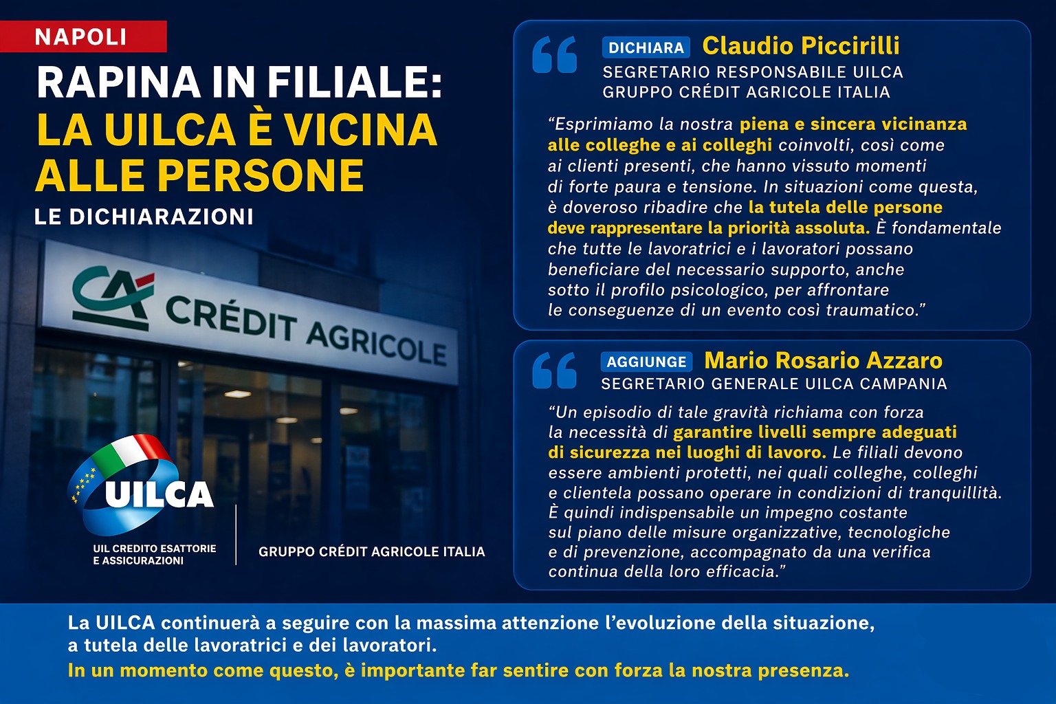 Siamo profondamente colpiti per quanto accaduto ieri presso la filiale Crédit Agricole di Napoli, teatro di una rapina particolarmente grave per modalità e dinamiche.